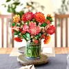 Dear Dahlia Grand: This bold and dramatic pop-up bouquet of Dear Dahlia displays a vibrant assortment of calla lilies, dahlias, and eucalyptus. This is sure to make a 'Grand' impression to any lucky recipient.