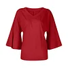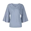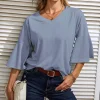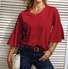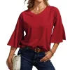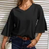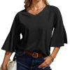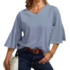 ☺ Features: Front V-neck, Back V-neck, 3/4 bell sleeves, loose hem. Unlike ordinary t-shirts, the bell sleeve design adds a touch of uniqueness. Lightweight, bouncy, sleek, simple, and elegant. A versatile piece in a woman's wardrobe.